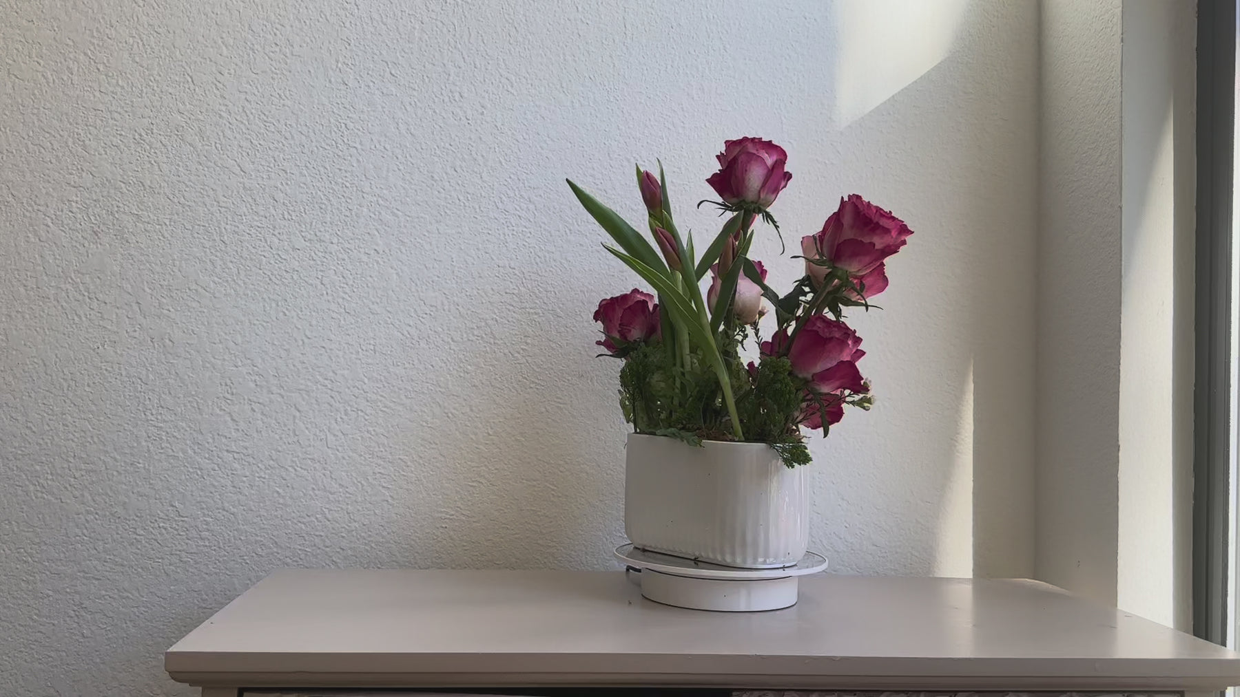 Arranged in a white ceramic oval vase. Shown with seven roses. Note child's birthday year in the card section and we will adjust the number of roses. The center rose will always be the largest.