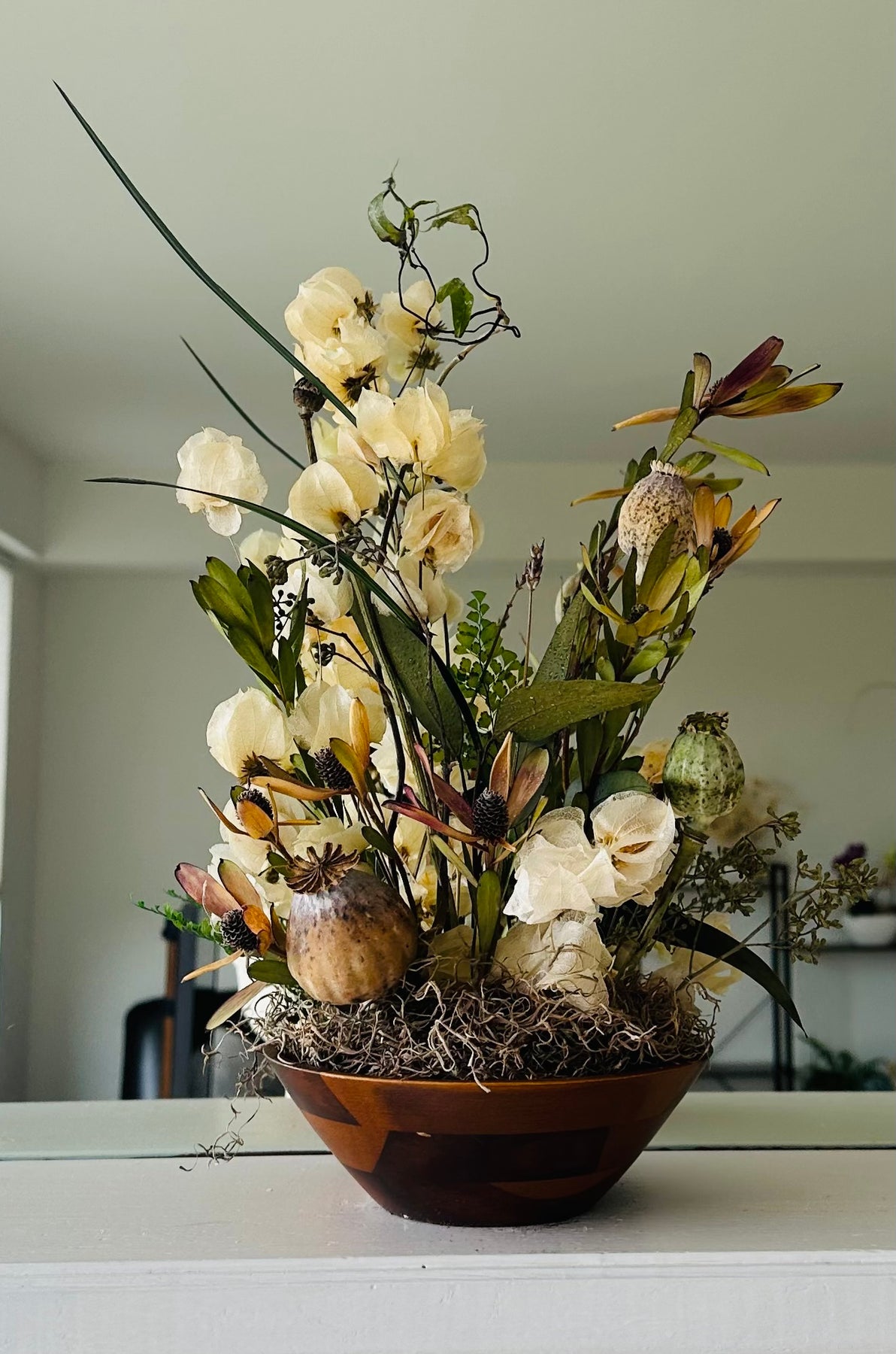 This item also ships nationwide. Colors may vary, but will include ferns, eucalyptus, seasonal freshly dried focal flowers and pods, bougainvillea. This arrangement is 100% natural, made with real flowers, and should last about a year.