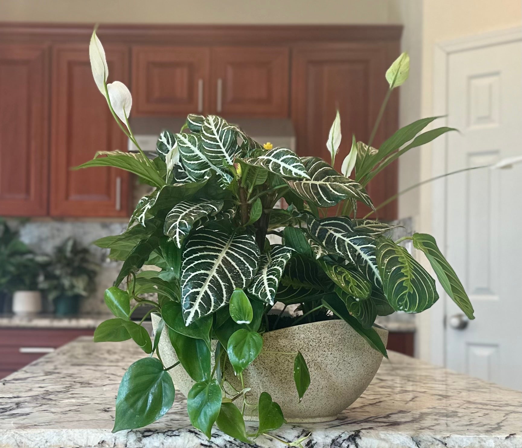 Premium Potted Blooming Plant. Shown here is a 4 inch Peace Lily with white blooms. These hand-selected premium plants have been nurtured into bloom along with our orchids. The plant is approximately 18 inches tall.