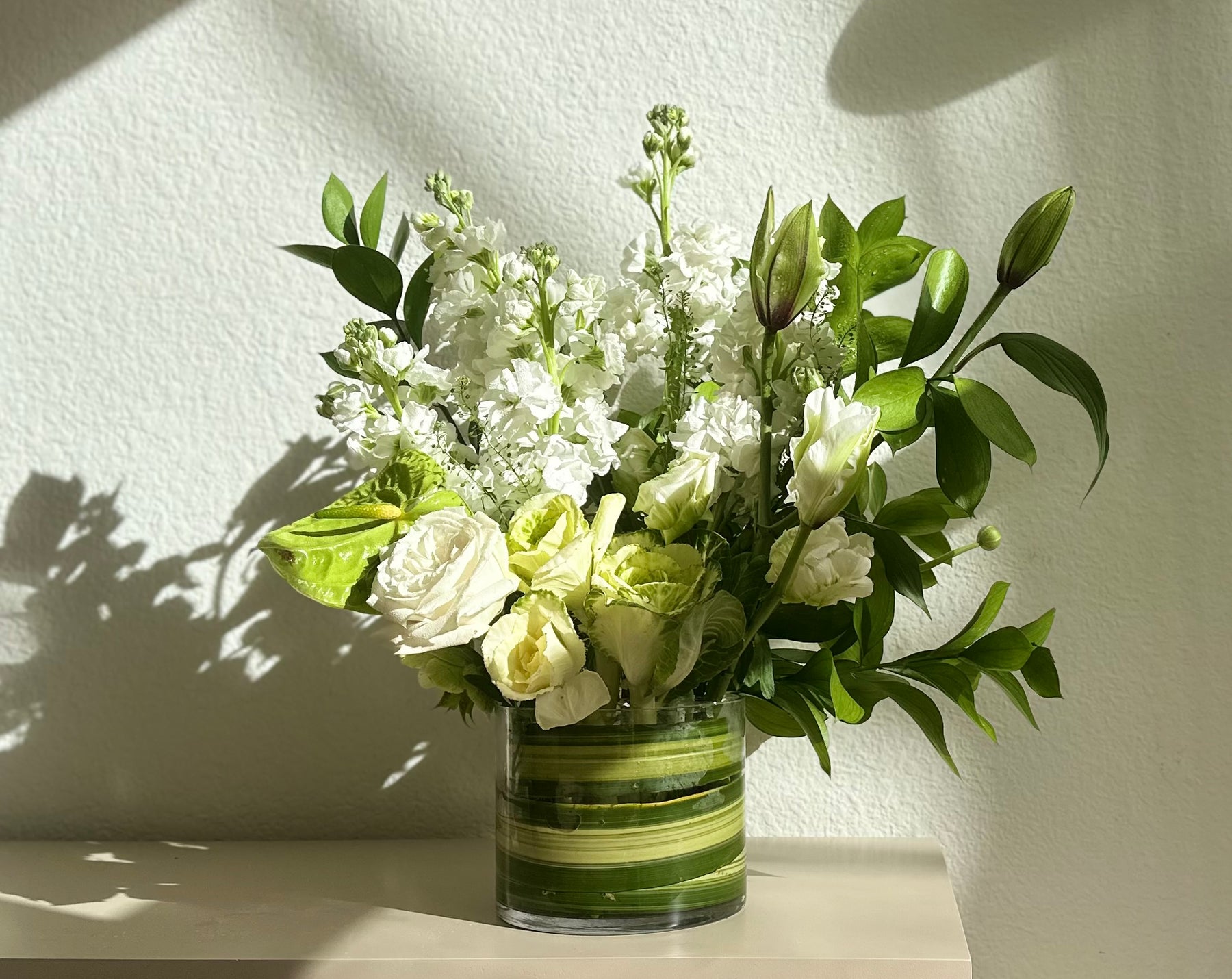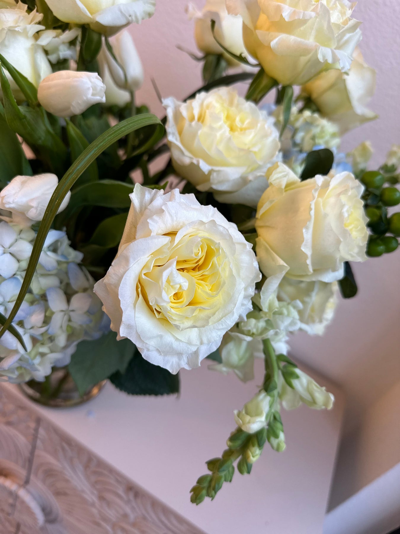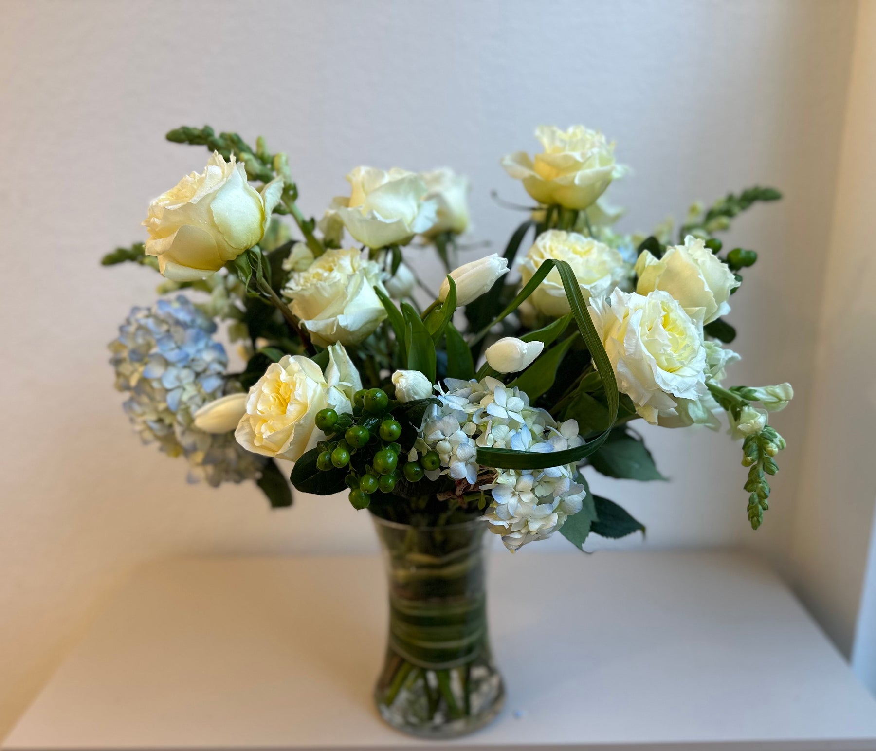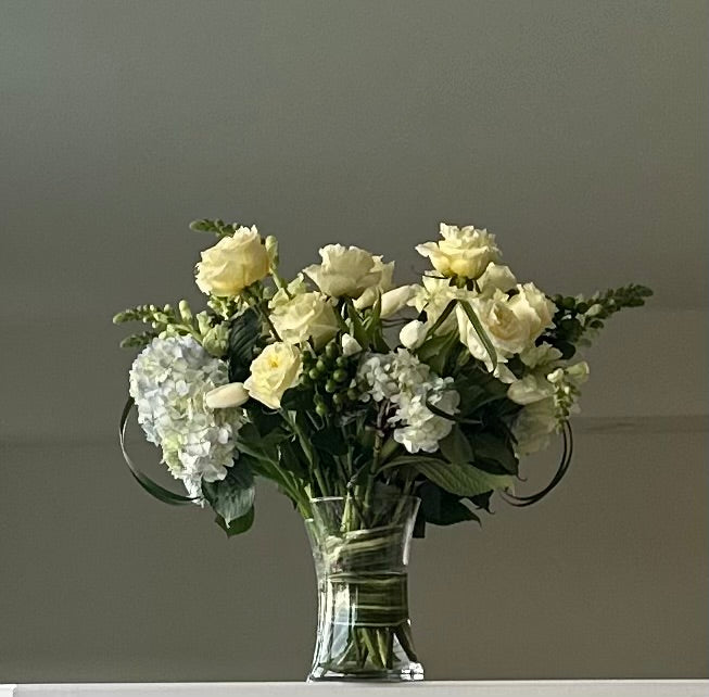 The brightest and most beautiful white and pastel blooms in a larger size. Focal flowers may include dahlias, peonies or garden roses. It is at least 20 inches high.